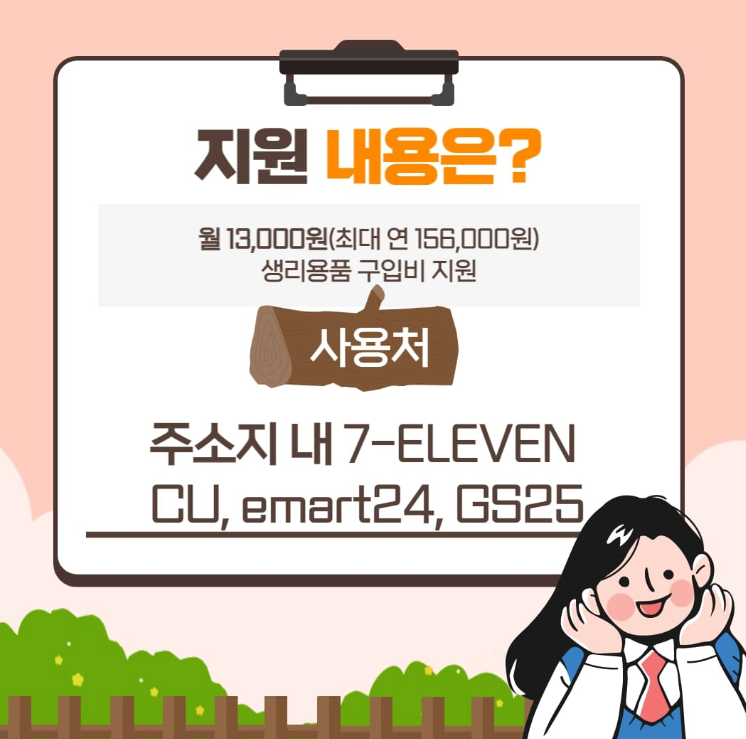 매달 필수적으로 소비할 수밖에 없는 생리대 소비지출에 대한 부담감을 줄여주고자 정부에서 최대 156,000원(월 1만3천원)을 지원해주고 있습니다. 청소년, 자녀분을 키우고 있는 부모님께서는 꼭 확인하시어 혜택을 보시기 바랍니다.