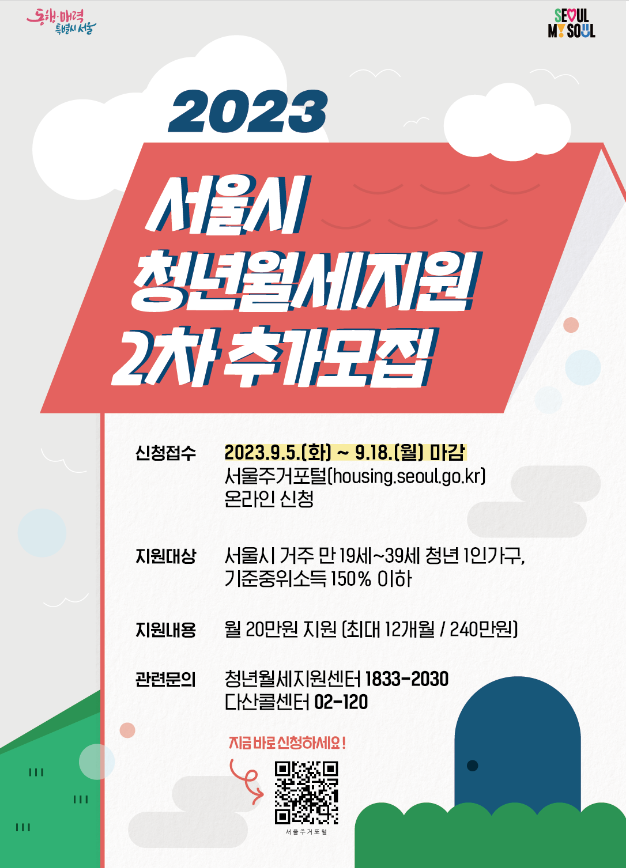 서울시에서는 청년들의 주거비 부담 완화와 안정적인 주거 환경을 마련하기 위해 서울시 '청년월세지원'이 9월 5일(화)부터 2차 추가 모집할 예정입니다. 서울에 거주하는 청년이라면 월 20만원의 월세를 지원받을 수 있습니다.