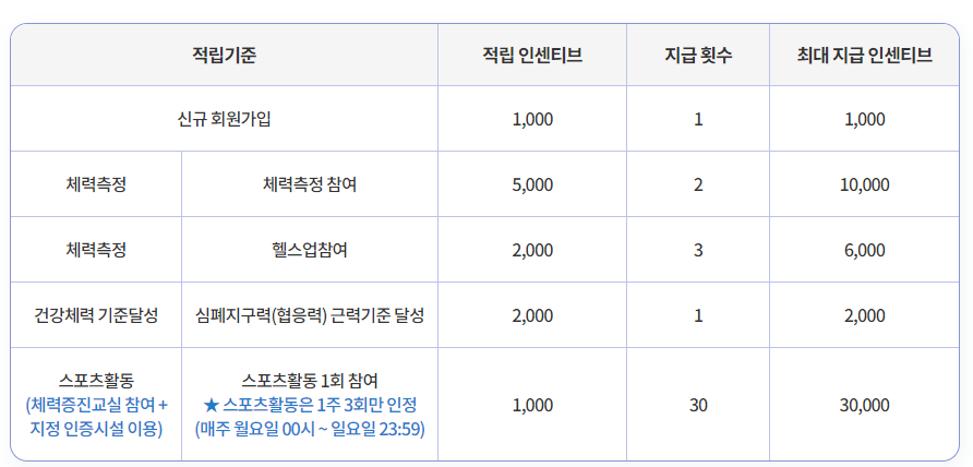 국민체력100의 다양한 체력관리 서비스와 스포츠활동에 참여 후 적립 기준에 따라 인센티브를