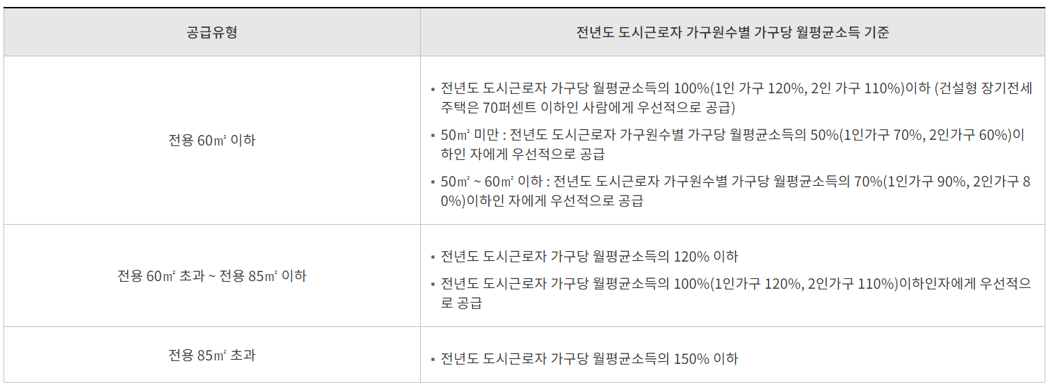 - 위순위 내에서 경쟁이 있는 경우 본인과 세대원 소득금액의 합이 가구당 월평균 소득의 70%이하인