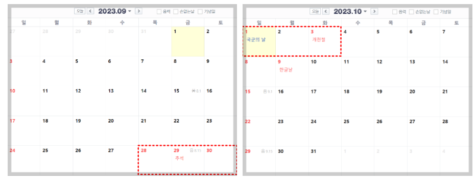 하지만 추석 휴무일인 9월 28일~30일에 주말인 토요일이 포함되어 있어 휴일이 하루 줄어든 느낌입니다.