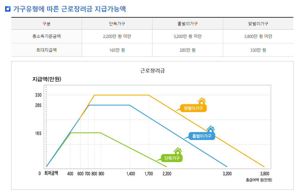 일은 하지만 소득이 적어 생활이 어려운 근로자, 사업자(전문직 제외)가구에 대하여 가구원 구성과 근로소득, 사업소득 또는 종교인소득에 따라 산정된 근로장려금을 지급함으로써 근로를 장려하고 실질소득을 지원하는 근로연계형 소득지원 제도입니다.