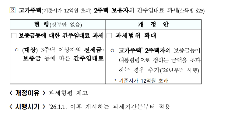 2026년부터 시행될 예정으로, 고가 주택을 두 채 보유한 개인이 받는 전세 보증금에 대해 소득세를 부과하는 것입니다.